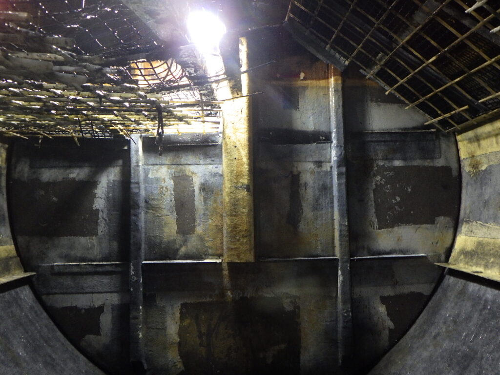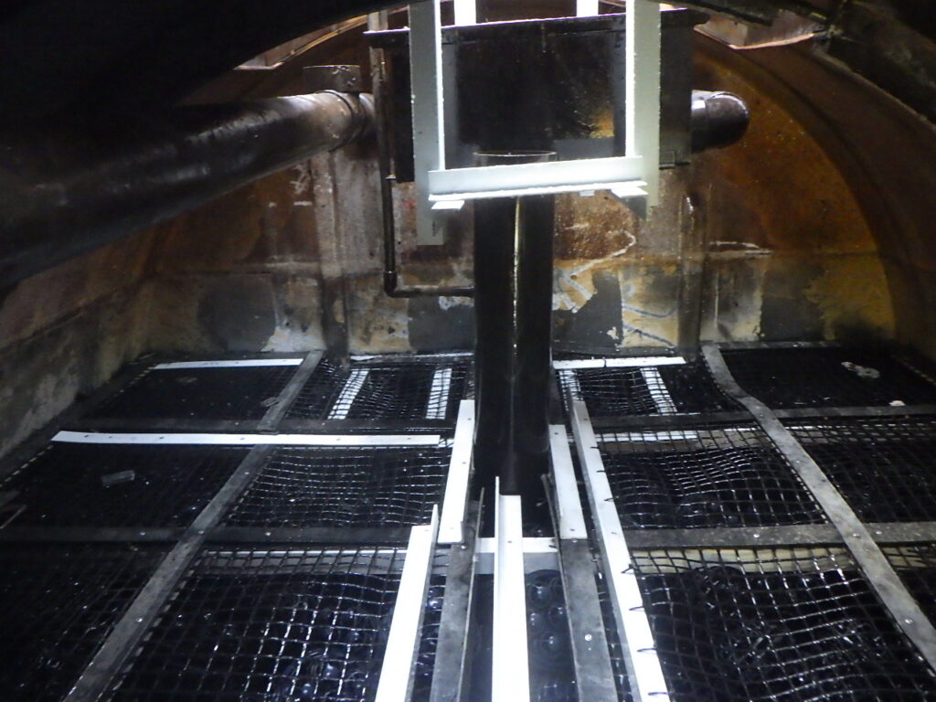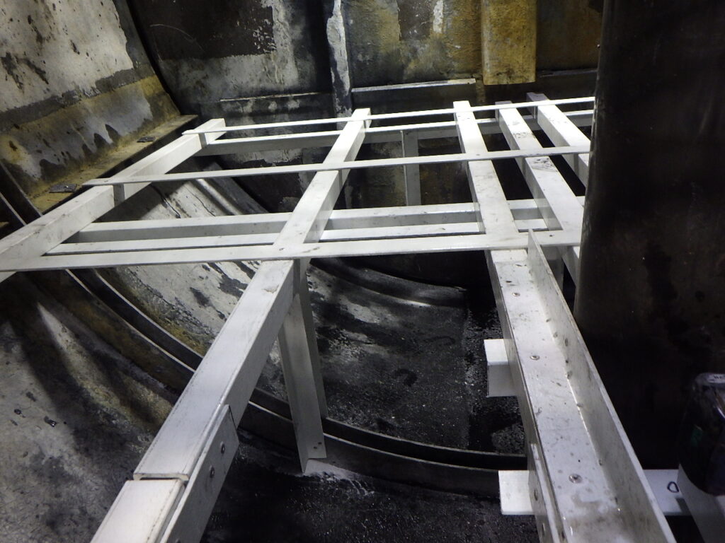 ろ材の受け架台が劣化し外れ落ちていたため、新しく受け架台をFRPパイプ等を使い作成・設置を行っております。